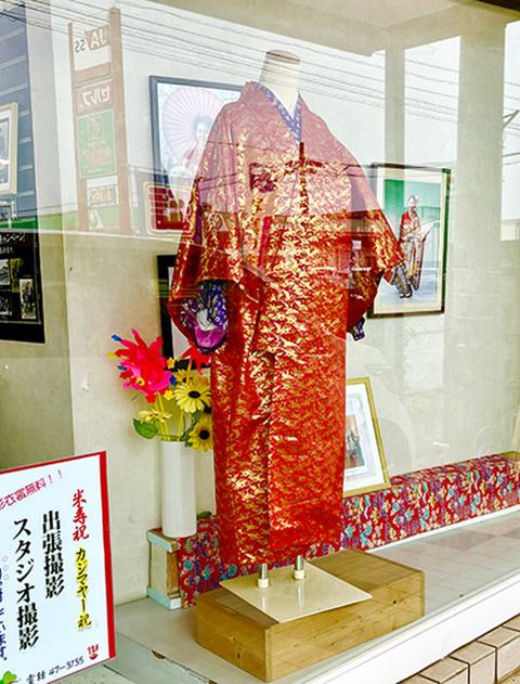 お祝いのとうじつは、女性は華やかな紅型の着物のうえに赤い金襴の衣装をお召になり